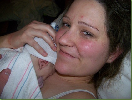 The hazy effect of the medication coupled with the concentration it took to get through the intense contractions had actually made me forget that I was going to be pushing out a baby in the near future. I panicked a little when it was time to start, begging my midwife for a few minutes break. She somehow managed to calm me down and convince me that I didn’t need any more time, I just needed to focus and my baby would be out soon. Joe was a little freaked out at that point, but he didn’t have time to dwell on it. The nurse grabbed one of my legs and instructed him to take the other. When I started pushing, I was a little hesitant at first. With encouragement from Joe, the nurse and midwife, I started working harder and harder. During a rest between contractions, I turned to Joe and asked if he could see the baby yet. Both he and the midwife emphatically said “YES!”